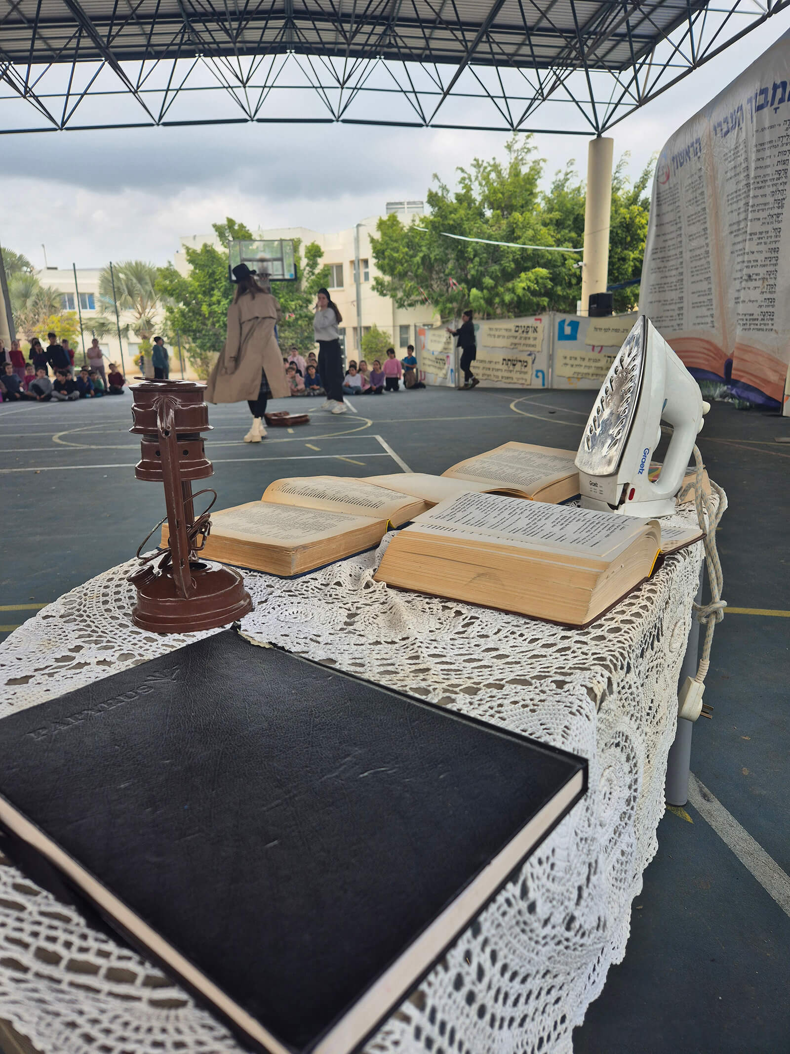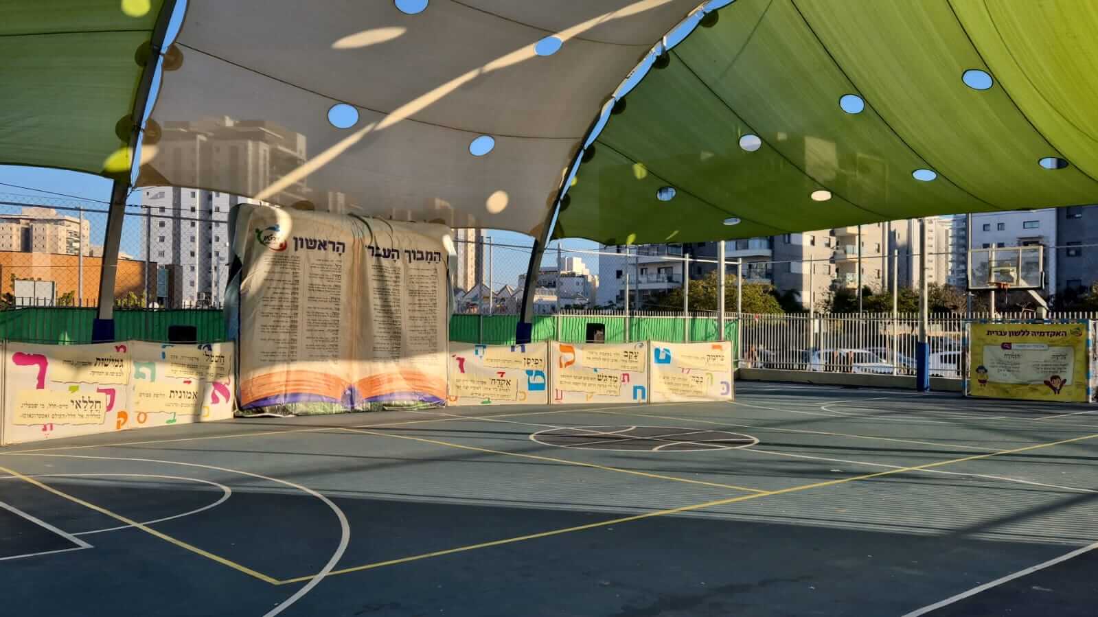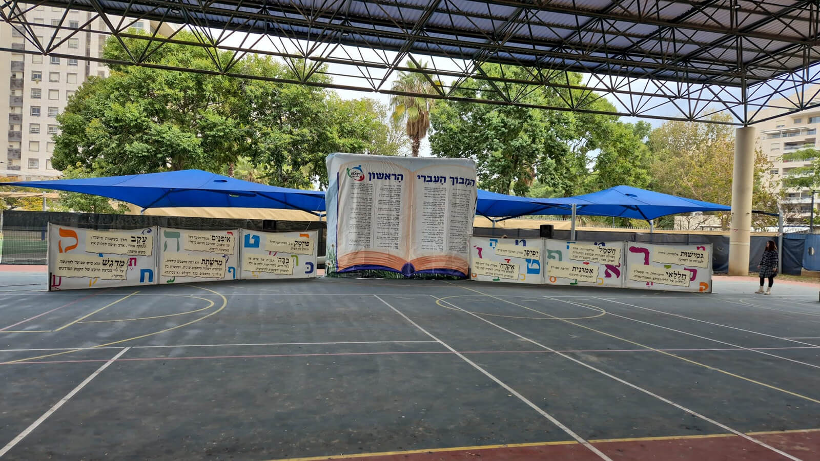 ברחבה המרכזית של בית הספר מוקמת תפאורת ענק מרהיבה המדמה עמוד מילון עברי ענק, ולצידו הגדרות, מושגים ומילים מתחדשות. סביבו נבנה מבוך צבעוני מלא בתחנות פעילות חווייתיות ומשחקים, כולם עוסקים בתחיית הלשון העברית ובאהבת השפה.